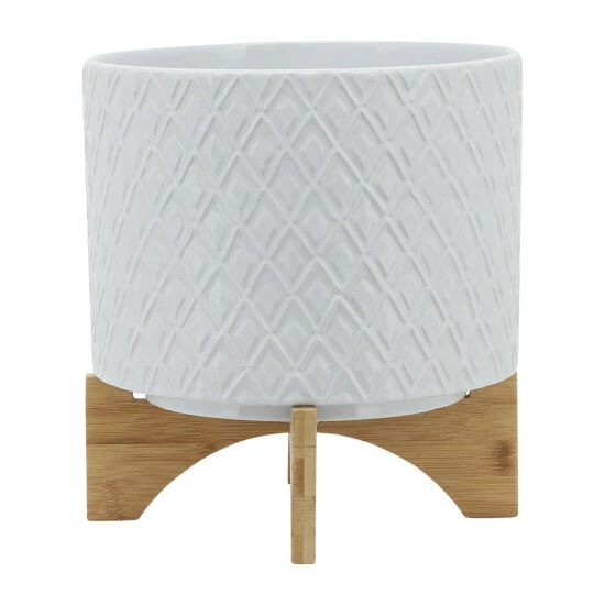 11″ Diamond Planter with Wood Stand. Made of Ceramic with a diamond pattern, light grey ombre in color and gloss finish. No Drainage holes. The planter is made of ceramic with a diamond textured pattern, creating more depth and dimension. The perfect planter for planting succulents, terrariums, and indoor house plants. Item Dimensions:11x11x8/Planter 1 Only Dims:11x11x8/Color: White Materials: Ceramic Category: Outdoor Decor, Planters Product Theme/Style/Trend: Contemporary Country Of Manfacture: Cn