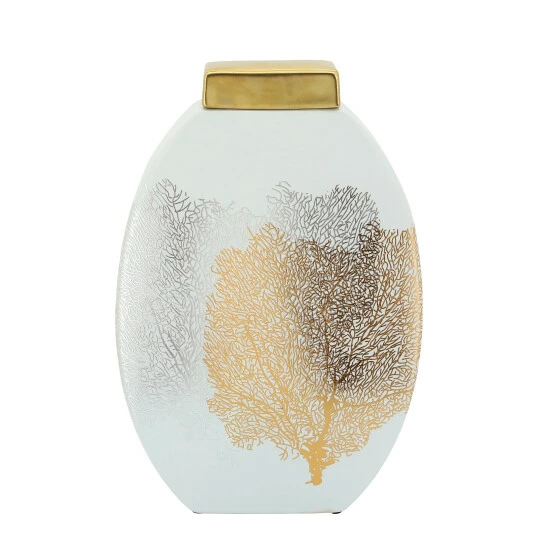 Ceramic oval shaped vase that has a lid. This jar has an off white and gold coloring along with a floral/tree design on the body.Sagebrook Home has been formed from a love of design, a commitment to service and a dedication to quality. They create and import fashion forward items in the most popular design styles. Backed with years of experience in the textile field, They are now providing a complete Home decor story. the combination of wall decor, furniture, lighting and Home accessories are all coordinated with textiles to provide a complete Home look. Sagebrook Home is committed to providing the best Home dΓ©cor and accent pieces at value prices. Item Dimensions:9x4x12/Color: Gold Materials: Ceramic Category: Vases And Jars, Jars Product Theme/Style/Trend: Contemporary Country Of Manfacture: Cn