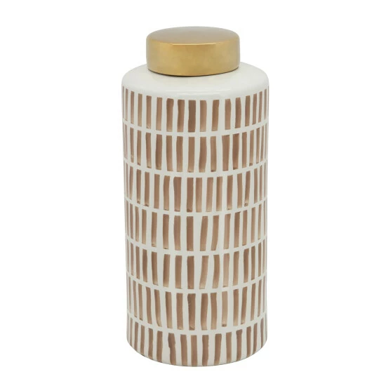 This jar will be the ideal item to make your home decor stand out. Indulge in artful style with this beautiful ceramic jar. It features a unique pattern with an attractive gold lid that will accentuate your living or work space.Sagebrook Home has been formed from a love of design, a commitment to service and a dedication to quality. They create and import fashion forward items in the most popular design styles. Backed with years of experience in the textile field, They are now providing a complete Home decor story. the combination of wall decor, furniture, lighting and Home accessories are all coordinated with textiles to provide a complete Home look. Sagebrook Home is committed to providing the best Home dΓ©cor and accent pieces at value prices. Item Dimensions:6x6x13/Color: Brown Materials: Ceramic Category: Vases And Jars, Jars Product Theme/Style/Trend: Transitional Country Of Manfacture: Cn