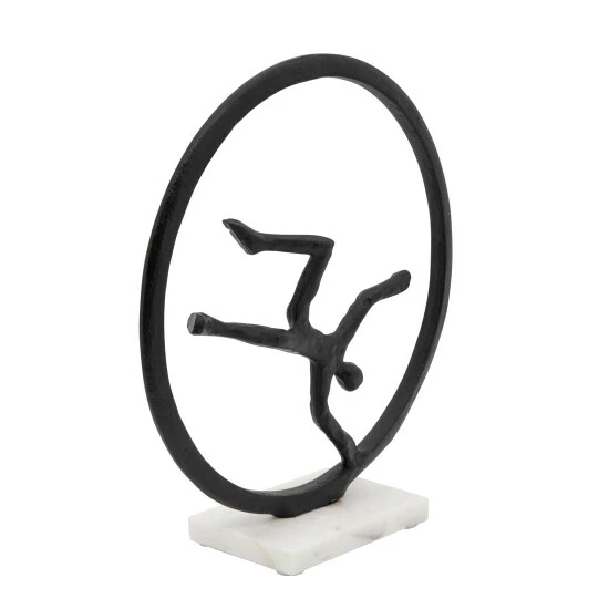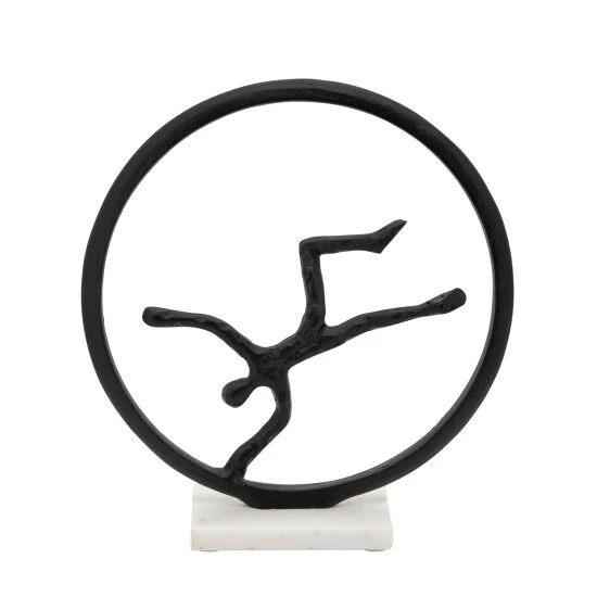 Celebrate the art of movement with this stunning sculpture of a doing a cartwheel. Given a very sophisticated dance like stance, this piece will bring elegance and soft curves to you home. All brought to balance a top any table top or shelf with the use of a true white marble base. Perfect piece of decorative inspiration for anyone in the family. Item Dimensions:13x4x14/Color: Black Materials: Aluminum, Marble, Iron Category: Decorative Accessories, Sculptures Product Theme/Style/Trend: Contemporary Country Of Manfacture: In