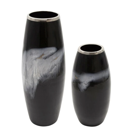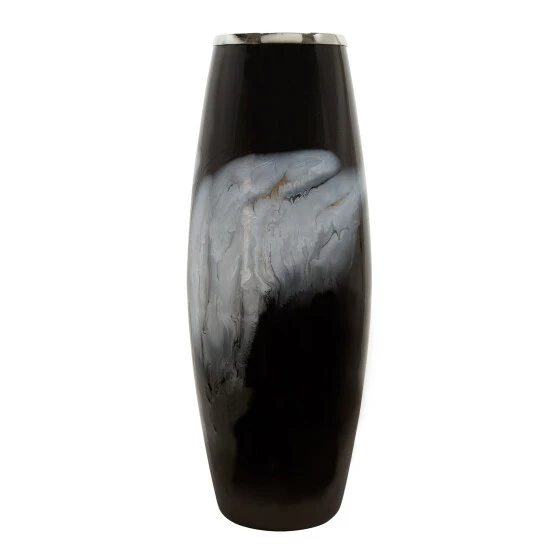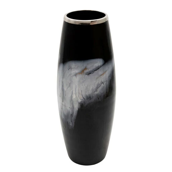 Enhance your table top with this beautiful glass vase. The black background will make the white inkblot pop, enhanced by a silver metal ring. This vase is sure to bring an artistic piece to your decor, inspired by inkblot tests to test the imagination of your guests and family. An amazing center piece for any table top or console table. Item Dimensions:9x9x24/Color: Black Materials: Metal, Glass, Iron Category: Vases And Jars, Vases Product Theme / Style / Trend: Contemporary Country Of Manfacture: In