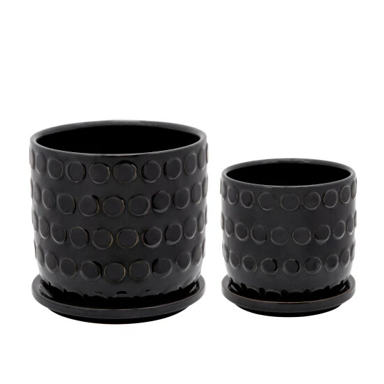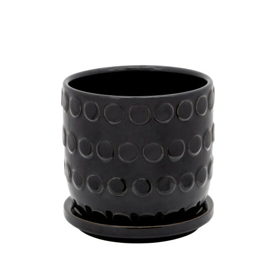 5″ Bubble Planter with Saucer, black. Made of Ceramic with bubble pattern, black in color with semi gloss finish. Comes with drainage holes and attached water-catching saucers. Planters and Saucers are both black.Sagebrook Home has been formed from a love of design, a commitment to service and a dedication to quality. They create and import fashion forward items in the most popular design styles. Backed with years of experience in the textile field, They are now providing a complete Home decor story. the combination of wall decor, furniture, lighting and Home accessories are all coordinated with textiles to provide a complete Home look. Sagebrook Home is committed to providing the best Home dΓ©cor and accent pieces at value prices. Item Dimensions:5x5x5/Color: Black Materials: Ceramic Category: Outdoor Decor, Planters Product Theme / Style / Trend: Contemporary Country Of Manfacture: Cn