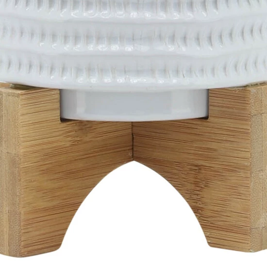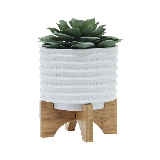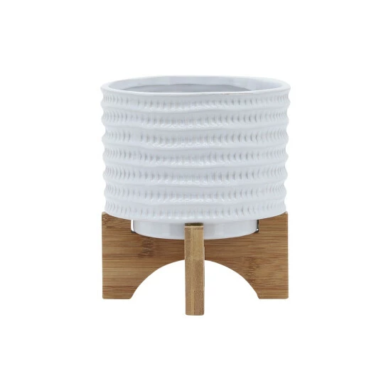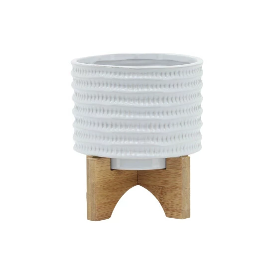 5″ Textured Ceramic Planter with wood Stand. This light grey planter is an attractive piece on its own. Combined with a wood shelf/stand, it makes a modern statement in addition to holding plants. Planter does not have drainage holes. The perfect planter for planting succulents, terrariums, and indoor house plants. Planter is a light grey ombre with a glossy finish. Item Dimensions:5.5×5.5×5/Planter 1 Only Dims:6x6x5/Color: White Materials: Ceramic Category: Outdoor Decor, Planters Product Theme/Style/Trend: Contemporary Country Of Manfacture: Cn