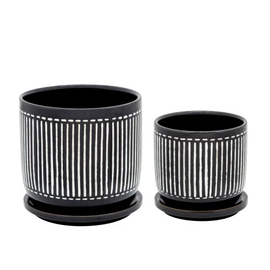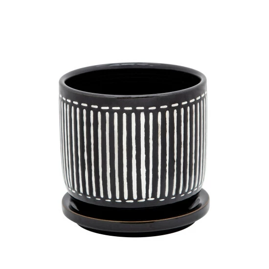 5″ Vertical Lines Planter with Saucer, black. The ceramic planter bowl provides the versatility, while the design adds a touch of formal style to help them compliment a wide variety of indoor and outdoor decors. Comes with draining holes and attached water-catching saucers.Sagebrook Home has been formed from a love of design, a commitment to service and a dedication to quality. They create and import fashion forward items in the most popular design styles. Backed with years of experience in the textile field, They are now providing a complete Home decor story. the combination of wall decor, furniture, lighting and Home accessories are all coordinated with textiles to provide a complete Home look. Sagebrook Home is committed to providing the best Home dΓ©cor and accent pieces at value prices. Item Dimensions:5x5x5/Color: Black Materials: Ceramic Category: Outdoor Decor, Planters Product Theme / Style / Trend: Contemporary Country Of Manfacture: Cn