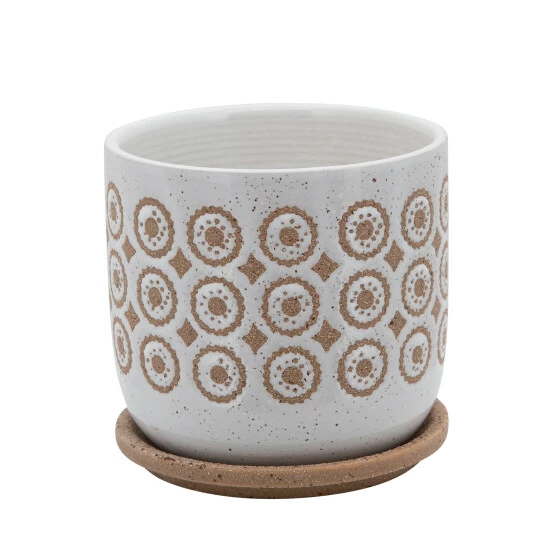 6″ Circles planter with saucer, Beige. Made of Ceramic with a circles pattern, beige base painted white in color, saucer is beige. The planter has a Circles textured pattern, creating more depth and dimension. The perfect planter for planting succulents, terrariums, and indoor house plants. .Sagebrook Home has been formed from a love of design, a commitment to service and a dedication to quality. They create and import fashion forward items in the most popular design styles. Backed with years of experience in the textile field, They are now providing a complete Home decor story. the combination of wall decor, furniture, lighting and Home accessories are all coordinated with textiles to provide a complete Home look. Sagebrook Home is committed to providing the best Home dΓ©cor and accent pieces at value prices. Item Dimensions:6x6x6/Color: Ivory/beige Materials: Ceramic Category: Outdoor Decor, Planters Product Theme / Style / Trend: Contemporary Country Of Manfacture: Cn
