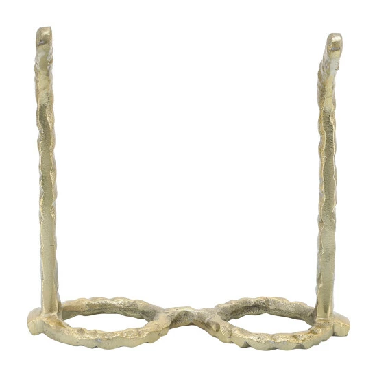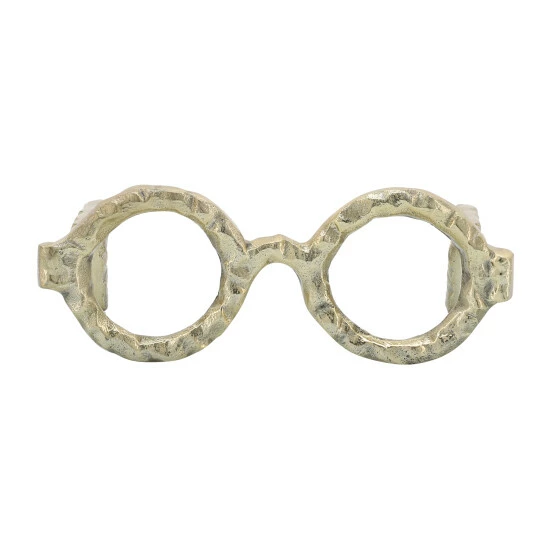A truly unique piece, this frame sculpture will surely attract attention. This is a wonderful accent for an office or your living room. Simple and elegant is a must have item in any office and this aluminum glasses will just do that. The dented design adds depth to this decorative accent. Item Dimensions:8x8x3/Color: Gold Materials: Aluminum Category: Decorative Accessories, Decorative Objects Product Theme / Style / Trend: Transitional Country Of Manfacture: In