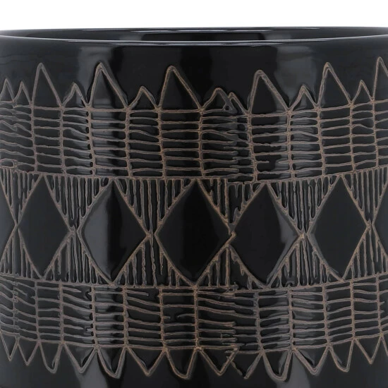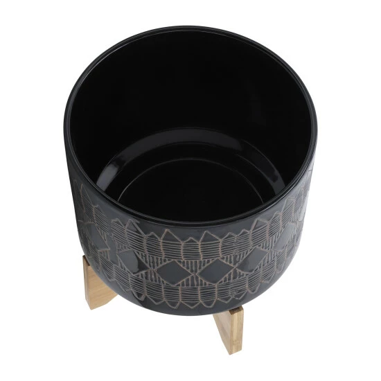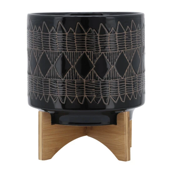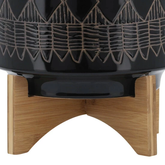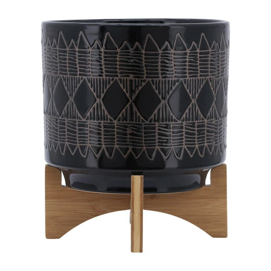 Beautiful ceramic round planters sitting on a wood stand with gorgeous and colorful designs on the exterior. These stunning planters will look great in your living room or outdoor space. Finished both inside and out looks great with or without plant. Works well with a strong color!Sagebrook Home has been formed from a love of design, a commitment to service and a dedication to quality. They create and import fashion forward items in the most popular design styles. Backed with years of experience in the textile field, They are now providing a complete Home decor story. the combination of wall decor, furniture, lighting and Home accessories are all coordinated with textiles to provide a complete Home look. Sagebrook Home is committed to providing the best Home décor and accent pieces at value prices. Item Dimensions:10x10x11/Planter 1 Only Dims:9.75×9.75×8.5/Color: Black Materials: Ceramic, Wood, Rubber Wood Category: Outdoor Decor, Planters Product Theme/Style/Trend: Contemporary Country Of Manfacture: Cn