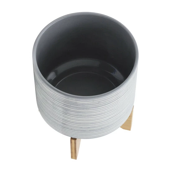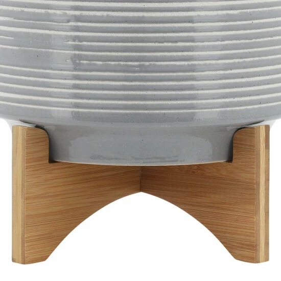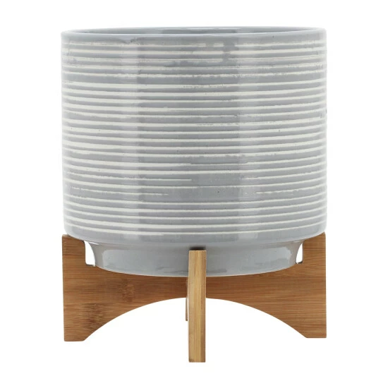 A brushed pattern with texture describes this planter. Looks great with a plant or without one. The natural wood base gives a natural feel. Sagebrook Home has been formed from a love of design, a commitment to service and a dedication to quality. They create and import fashion forward items in the most popular design styles. Backed with years of experience in the textile field, They are now providing a complete Home decor story. the combination of wall decor, furniture, lighting and Home accessories are all coordinated with textiles to provide a complete Home look. Sagebrook Home is committed to providing the best Home dรฉcor and accent pieces at value prices. Item Dimensions:9.75×9.75×11.5/Planter 1 Only Dims:9.75×9.75×8.5/Color: Gray Materials: Ceramic, Wood, Rubber Wood Category: Outdoor Decor, Planters Product Theme/Style/Trend: Contemporary Country Of Manfacture: Cn