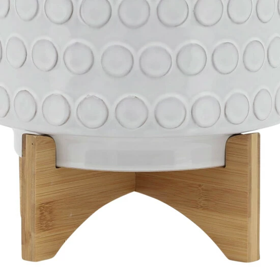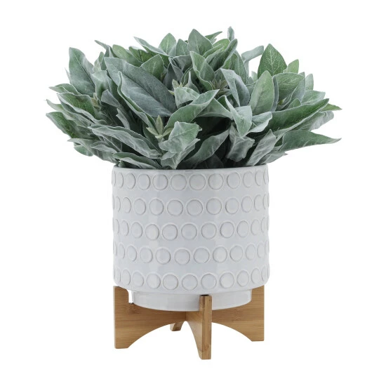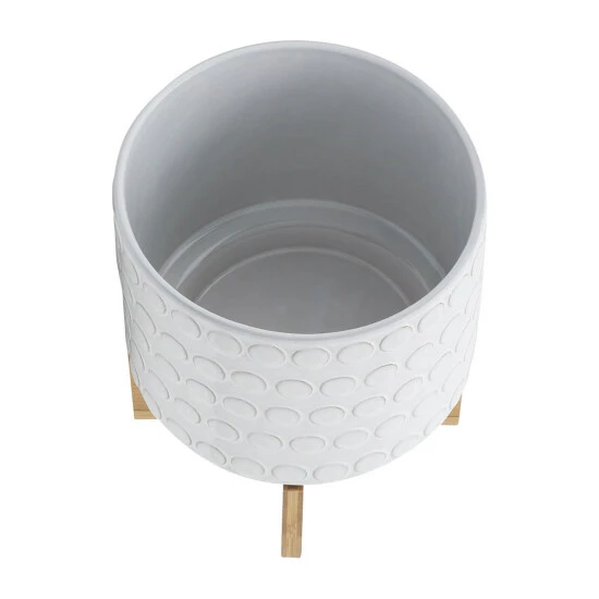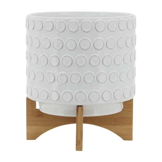 This beautiful ceramic planter with designs on the exterior, This stylish planter is the perfect decor for any piece of the room. These stunning planters will look great in your living room, front entryway, or outdoor space. This tabletop planter will add a bit of chic nature to your living space. Item Dimensions:10x10x12/Planter 1 Only Dims:9.75×9.75×8.5/Color: Ivory/beige Materials: Ceramic, Wood, Rubber Wood Category: Outdoor Decor, Planters Product Theme/Style/Trend: Contemporary Country Of Manfacture: Cn
