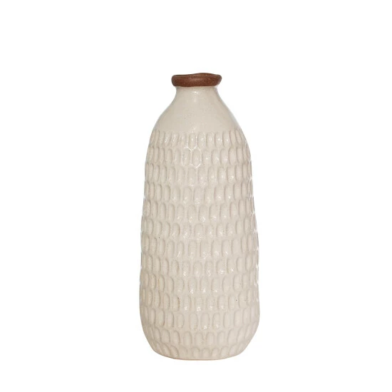 Bright white glaze brings deeply chevron into crisp focus, pairing bold pattern to the colorful bouquet. Graceful bottle shaped vase displays in rustic hand-carved the design and exposed Terra cottar lip and base. With a striking ceramic shape that lends a contemporary twist, this vase is kind of stand out piece that can spruce up your sprouts and your space. Its small size is perfect for cuttings and small floral arrangements. Item Dimensions:5.25×5.25×12.25/Color: Brown Materials: Ceramic Category: Vases And Jars, Vases Product Theme/Style/Trend: Casual Home Country Of Manfacture: Cn