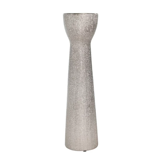Whether itβs being used to dress up an entryway vignette or add a dash of bold flavor to a tables cape, this candle holder is sure to grab glances. Crafted from ceramic, this candle holder will add a touch of glam to any space its placed. Perfect item to be masterpiece, creating a stunning centerpiece. Item Dimensions:4.25×4.25×16/Color: Silver Materials: Ceramic Category: Candles, Candle Holders And Lanterns, Candle Holders And Tealights Product Theme/Style/Trend: Glam Country Of Manfacture: Cn