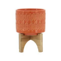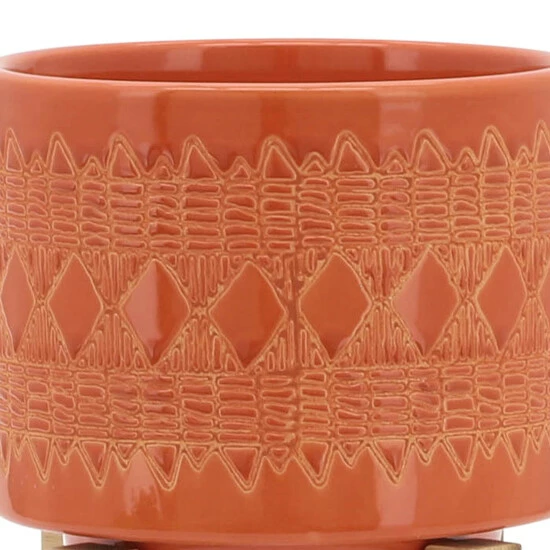 Ceramic planter with aztec design on the exterior. It has a glossy finish and the wood stand is glued to the planter. This beautiful piece will be a great addition to your living room or entry way.Sagebrook Home has been formed from a love of design, a commitment to service and a dedication to quality. They create and import fashion forward items in the most popular design styles. Backed with years of experience in the textile field, They are now providing a complete Home decor story. the combination of wall decor, furniture, lighting and Home accessories are all coordinated with textiles to provide a complete Home look. Sagebrook Home is committed to providing the best Home dรฉcor and accent pieces at value prices. Item Dimensions:5x5x6/Color: Orange Materials: Ceramic, Bamboo Wood Category: Outdoor Decor, Planters Product Theme/Style/Trend: Contemporary Country Of Manfacture: Cn
