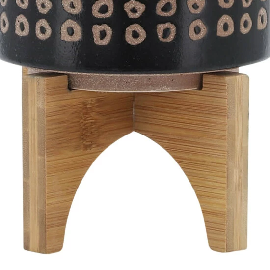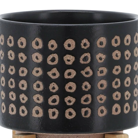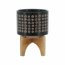 This hand painted planter gives a bold tribal feel. Finished both inside and out it looks great with or without a plant. Works well with a neutral pallet.Sagebrook Home has been formed from a love of design, a commitment to service and a dedication to quality. They create and import fashion forward items in the most popular design styles. Backed with years of experience in the textile field, They are now providing a complete Home decor story. the combination of wall decor, furniture, lighting and Home accessories are all coordinated with textiles to provide a complete Home look. Sagebrook Home is committed to providing the best Home décor and accent pieces at value prices. Item Dimensions:5.25×5.25×7/Planter 1 Only Dims:5x5x4.25/Color: Brown Materials: Ceramic, Wood, Rubber Wood Category: Outdoor Decor, Planters Product Theme/Style/Trend: Contemporary Country Of Manfacture: Cn