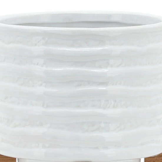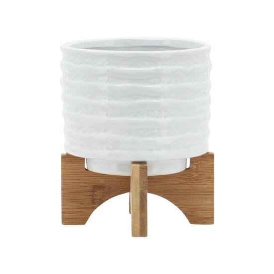 Be proud of your garden by accessorizing all your favorite plants with this stylish white ceramic pot. The vessel is being held up by a wood stand ad has a ridged design in the exterior. There is no drainage hole, guaranteed to not have a mess.Sagebrook Home has been formed from a love of design, a commitment to service and a dedication to quality. They create and import fashion forward items in the most popular design styles. Backed with years of experience in the textile field, They are now providing a complete Home decor story. the combination of wall decor, furniture, lighting and Home accessories are all coordinated with textiles to provide a complete Home look. Sagebrook Home is committed to providing the best Home dรฉcor and accent pieces at value prices. Item Dimensions:6x6x7/Planter 1 Only Dims:6x6x5/Color: White Materials: Ceramic, Wood, Bamboo Wood Category: Outdoor Decor, Planters Product Theme/Style/Trend: Contemporary Country Of Manfacture: Cn
