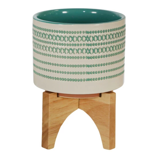 This planter pot will make the perfect addition to your home or office decor. It can complement any of your existing furniture, or be used in any corner. Crafted from ceramic, sitting atop a wooden stand adding height and style. The textured turquoise dots design will give a stand out feature, well the matching interior color will contrast your beautiful plants. The stand not only adds height and style, but its also perfect to protect your delicate surfaces. Perfect for offices, bedrooms , or any corner of your home. Item Dimensions:5x5x7/Planter 1 Only Dims:5x5x4.25/Color: Turq/teal Materials: Ceramic, Wood, Bamboo Wood Category: Outdoor Decor, Planters Product Theme/Style/Trend: Contemporary Country Of Manfacture: Cn