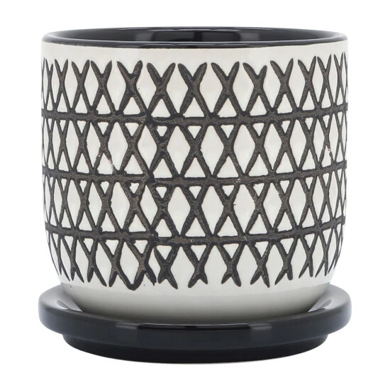 Ceramic planter with dot and X design on the exterior. It has a matte finish and the saucer is glued to the planter. Drain hole on bottom of planter This beautiful piece will be a great addition to your living room or entry way.Sagebrook Home has been formed from a love of design, a commitment to service and a dedication to quality. They create and import fashion forward items in the most popular design styles. Backed with years of experience in the textile field, They are now providing a complete Home decor story. the combination of wall decor, furniture, lighting and Home accessories are all coordinated with textiles to provide a complete Home look. Sagebrook Home is committed to providing the best Home dรฉcor and accent pieces at value prices. Item Dimensions:5x5x5/Color: Black Materials: Ceramic Category: Outdoor Decor, Planters Product Theme / Style / Trend: Contemporary Country Of Manfacture: Cn