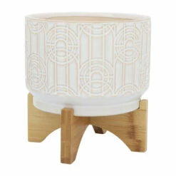 Ceramic planter with circles design on the exterior. It has a non-glossy finish and the wood stand is glued to the planter. This beautiful piece will be a great addition to your living room or entry way.Sagebrook Home has been formed from a love of design, a commitment to service and a dedication to quality. They create and import fashion forward items in the most popular design styles. Backed with years of experience in the textile field, They are now providing a complete Home decor story. the combination of wall decor, furniture, lighting and Home accessories are all coordinated with textiles to provide a complete Home look. Sagebrook Home is committed to providing the best Home dΓ©cor and accent pieces at value prices. Item Dimensions:7x7x7/Color: White Materials: Ceramic Category: Outdoor Decor, Planters Product Theme/Style/Trend: Contemporary Country Of Manfacture: Cn