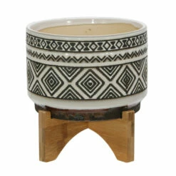 This hand painted planter gives a bold tribal feel. Finished both inside and out it looks great with or without a plant. Works well with a strong color pallet.Sagebrook Home has been formed from a love of design, a commitment to service and a dedication to quality. They create and import fashion forward items in the most popular design styles. Backed with years of experience in the textile field, They are now providing a complete Home decor story. the combination of wall decor, furniture, lighting and Home accessories are all coordinated with textiles to provide a complete Home look. Sagebrook Home is committed to providing the best Home dΓ©cor and accent pieces at value prices. Item Dimensions:7x7x8/Planter 1 Only Dims:7x7x5/Color: Ivory/beige Materials: Ceramic, Wood, Bamboo Wood Category: Outdoor Decor, Planters Product Theme/Style/Trend: Contemporary Country Of Manfacture: Cn