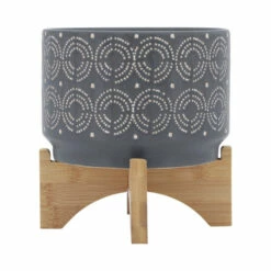 Ceramic planter with swirl and dot design on the exterior. It has a natural finish and the wood stand is glued to the planter. This beautiful piece will be a great addition to your living room or entry way.Sagebrook Home has been formed from a love of design, a commitment to service and a dedication to quality. They create and import fashion forward items in the most popular design styles. Backed with years of experience in the textile field, They are now providing a complete Home decor story. the combination of wall decor, furniture, lighting and Home accessories are all coordinated with textiles to provide a complete Home look. Sagebrook Home is committed to providing the best Home dΓ©cor and accent pieces at value prices. Item Dimensions:7x7x8/Color: Gray Materials: Ceramic Category: Outdoor Decor, Planters Product Theme / Style / Trend: Contemporary Country Of Manfacture: Cn
