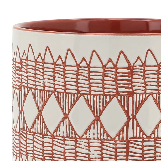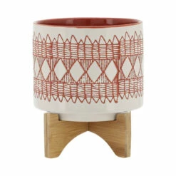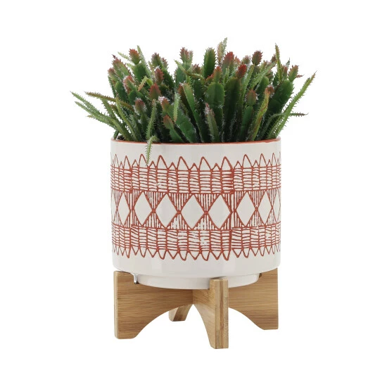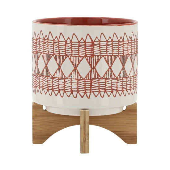 Ceramic planter with aztec design on the exterior. It has a non-glossy finish and the wood stand is glued to the planter. This beautiful piece will be a great addition to your living room or entry way.Sagebrook Home has been formed from a love of design, a commitment to service and a dedication to quality. They create and import fashion forward items in the most popular design styles. Backed with years of experience in the textile field, They are now providing a complete Home decor story. the combination of wall decor, furniture, lighting and Home accessories are all coordinated with textiles to provide a complete Home look. Sagebrook Home is committed to providing the best Home dรฉcor and accent pieces at value prices. Item Dimensions:8x8x9/Color: Orange Materials: Ceramic, Bamboo Wood Category: Outdoor Decor, Planters Product Theme/Style/Trend: Contemporary Country Of Manfacture: Cn