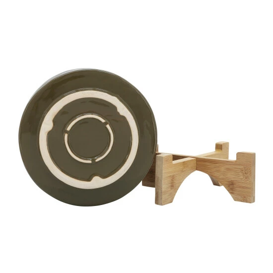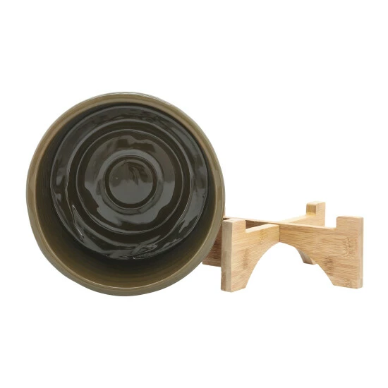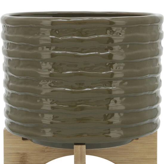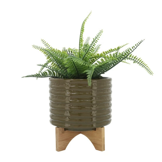 Ceramic planter with groove designs on the exterior. It has a glossy finish and the wood stand is glued to the planter. This beautiful piece will be a great addition to your living room or entry way.Sagebrook Home has been formed from a love of design, a commitment to service and a dedication to quality. They create and import fashion forward items in the most popular design styles. Backed with years of experience in the textile field, They are now providing a complete Home decor story. the combination of wall decor, furniture, lighting and Home accessories are all coordinated with textiles to provide a complete Home look. Sagebrook Home is committed to providing the best Home dรฉcor and accent pieces at value prices. Item Dimensions:8x8x7/Color: Green Materials: Ceramic Category: Outdoor Decor, Planters Product Theme/Style/Trend: Contemporary Country Of Manfacture: Cn
