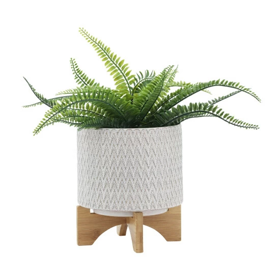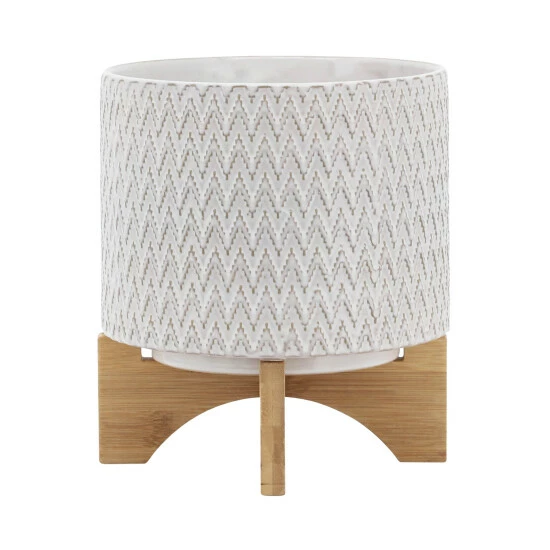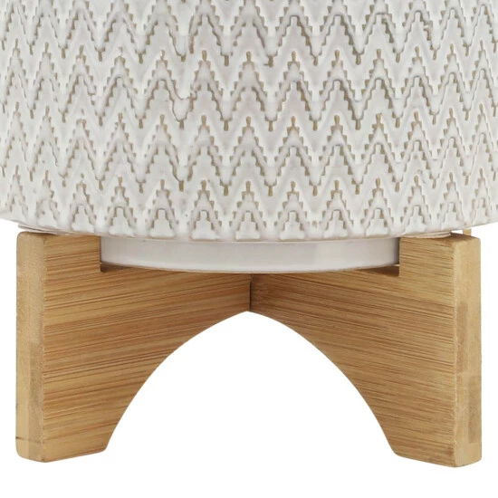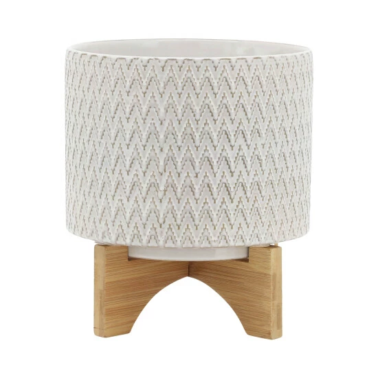 Beautiful ceramic round planter sitting on a wood stand with designs on the exterior. This stylish planter is the perfect decor for any piece of the room.Sagebrook Home has been formed from a love of design, a commitment to service and a dedication to quality. They create and import fashion forward items in the most popular design styles. Backed with years of experience in the textile field, They are now providing a complete Home decor story. the combination of wall decor, furniture, lighting and Home accessories are all coordinated with textiles to provide a complete Home look. Sagebrook Home is committed to providing the best Home décor and accent pieces at value prices. Item Dimensions:8.5×8.5×9/Planter 1 Only Dims:8x8x7/Color: Ivory/beige Materials: Ceramic, Wood, Bamboo Wood Category: Outdoor Decor, Planters Product Theme/Style/Trend: Contemporary Country Of Manfacture: Cn
