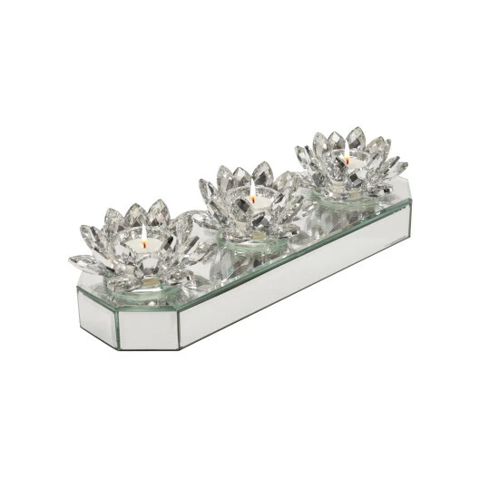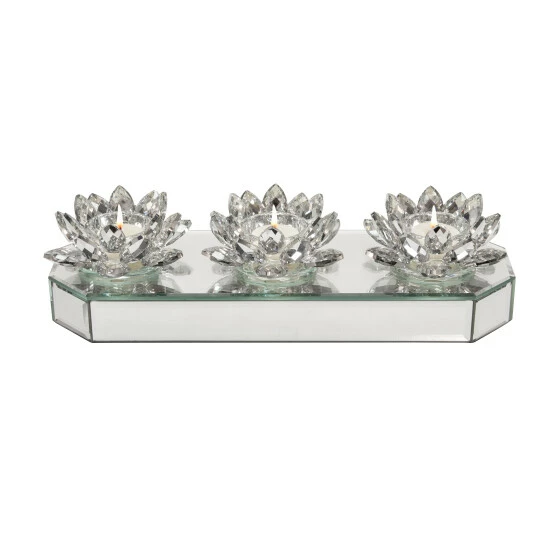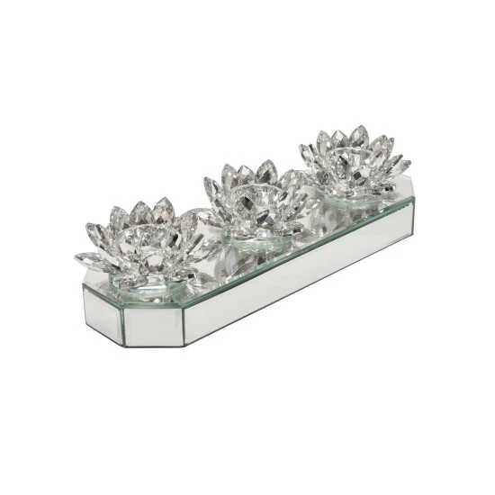 This 3 Candle Holder Glass Tea light Holder features 3 tea light candle holders. Very elegant in both day and evening, this candelabra glistens softly in candlelight. A variety of modern lotus crystal tea light will be a great item to decorate your home!Sagebrook Home has been formed from a love of design, a commitment to service and a dedication to quality. They create and import fashion forward items in the most popular design styles. Backed with years of experience in the textile field, They are now providing a complete Home decor story. the combination of wall decor, furniture, lighting and Home accessories are all coordinated with textiles to provide a complete Home look. Sagebrook Home is committed to providing the best Home décor and accent pieces at value prices. Item Dimensions:13x5x3/Color: Silver Materials: Glass, Mdf, Metal Category: Candles, Candle Holders And Lanterns, Candle Holders And Tealights Product Theme / Style / Trend: Glam Country Of Manfacture: Cn