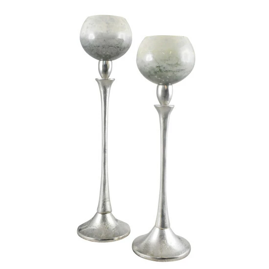 Big on style and elegance, this set is shaped like large wine glasses and finished with subtle hues. This holder is perfectly ideal and statement making for any home dining room, living room, or occasion such as a great dinner party. This Glass and Aluminum votive holder on stand is the missing ingredient to your home decor. Item Dimensions:5x5x18/Color: Silver Materials: Glass, Aluminum Category: Candles, Candle Holders And Lanterns, Candle Holders And Tealights Product Theme/Style/Trend: Glam Country Of Manfacture: In