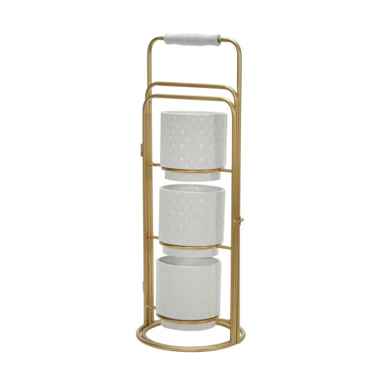 Bring a taste of the green outdoors into the comfort of your own home with just the addition of some fresh plants. Made of metal, this 3-tier planter stand is the perfect addition to your home assortment adding flair to your home. It features a stand, that allows this piece to be placed on the ground next to a desk, fireplace, or seating arrangement. Item Dimensions:16x12x22/Color: White Materials: Iron, Wood, Iron Category: Outdoor Decor, Planters Product Theme/Style/Trend: Contemporary Country Of Manfacture: Cn