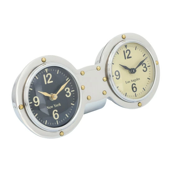 Have the luxury of time on any table top or desk. This dual clock will enhance any modern decor, perfect for a business individual who needs more than one time zone. Featuring a metal exterior that resembles old military plane dials, with a classic face in two colors for additional decorative detail. Item Dimensions:12x3x5/Color: Silver Materials: Aluminum Category: Decorative Accessories, Clocks Product Theme/Style/Trend: Contemporary Country Of Manfacture: In