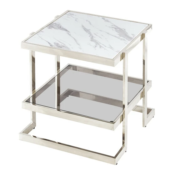 Marble, the epitome of style and elegance is the main feature of this stunning side table. With a silver base that includes a second tier with a mirror top. Modernized by geometric inspiration, this table will be the focus of the room, making your home a temple of interior design. Adding the perfect balance of cool and neutral colors to your abode. Item Dimensions:23.62×23.62×23.82/Color: Silver Materials: Stainless Steel, Glass Category: Furniture, Accent Tables Product Theme/Style/Trend: Contemporary Country Of Manfacture: Cn