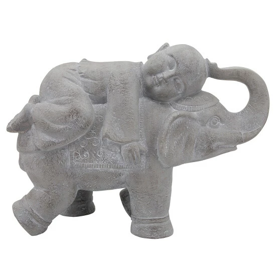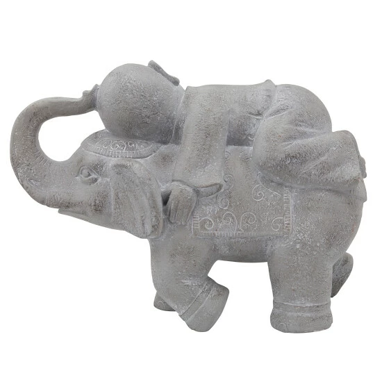 A whimsical elephant and elephant taking a stroll. Add this piece as a center piece in your living room or your outdoor area. This statue has a weathered exterior.