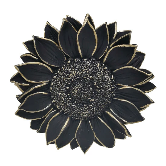 Enhance that empty wall space in your home with this astonishing black and gold resin sunflower. Featuring a matte black finish with impressive carved detail on each flower petal. The gold rim all around the design creates an elegant touch that will not overwhelm your home’s color scheme. The perfect subtle touch to bring the room together with style! Item Dimensions:7x7x1.5/Color: Black Materials: Polyresin Category: Wall Decor, Wall Flowers Product Theme/Style/Trend: Contemporary Country Of Manfacture: Cn