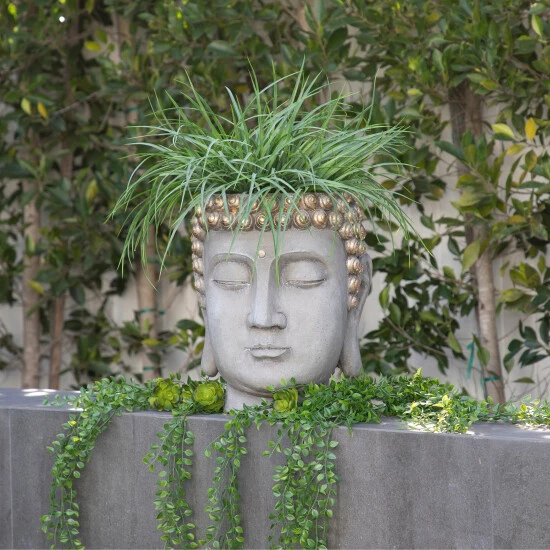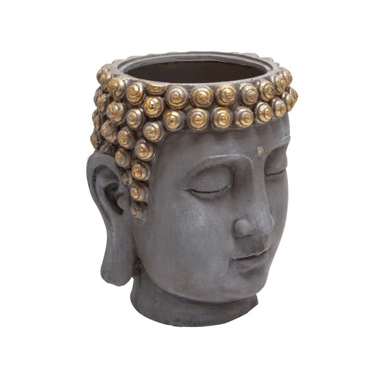 Don’t leave your living and work space to be plain and dull. Add excitement and depth to any room with this resin buddha head pot planter. Brimming with flair, this on-trend pot planter lets you house succulents, ferns, and flowers in style. A natural gray finish outfits the base for a warm touch, while the rim has gold circular accents for a pop of pattern. Item Dimensions:14.25x14x16.75/Color: Gold Materials: Polyresin Category: Outdoor Decor, Planters Product Theme / Style / Trend: Contemporary Country Of Manfacture: Cn