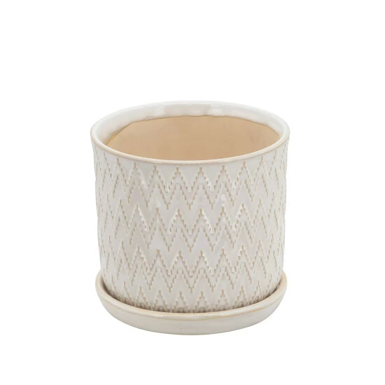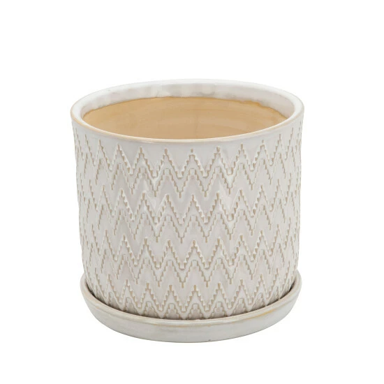 Place your favorite plants in this lovely set of planters. With a gorgeous zigzag pattern on the outside, these planters will be a great way to display two different size plants. With a circumference of 6″ and 8″, a neutral beige finish with a gloss coat that will allow them to beautifully fit into your inside or outside decor.