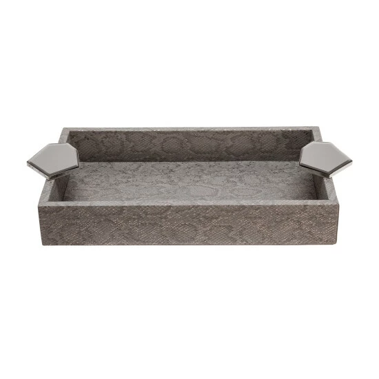 A perfect set of accent trays to help decorate your space. Made of wood and covered with faux leather material to give a stunning look. Featuring a lovely metal and glass set of handles for additional style. Made to match any glamorous dΓ©cor in your home, especially when used as a display tray on your console table or entry way.