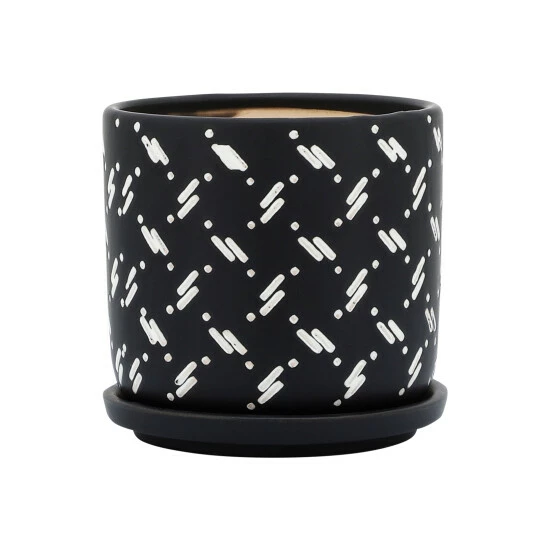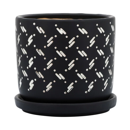 This ceramic planter displays a stunning white pattern on a black background, creating an astonishing design made to bring the color of your plant out! With a saucer attached to avoid any water spills on your carpet and or furniture!Sagebrook Home has been formed from a love of design, a commitment to service and a dedication to quality. They create and import fashion forward items in the most popular design styles. Backed with years of experience in the textile field, They are now providing a complete Home decor story. the combination of wall decor, furniture, lighting and Home accessories are all coordinated with textiles to provide a complete Home look. Sagebrook Home is committed to providing the best Home dΓ©cor and accent pieces at value prices. Item 1 Dimensions: 6x6x5/Color: Black Materials: Ceramic Category: Outdoor Decor, Planters Product Theme/Style/Trend: Contemporary Country Of Manfacture: Cn