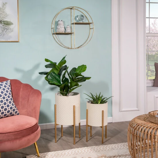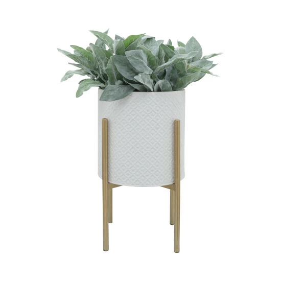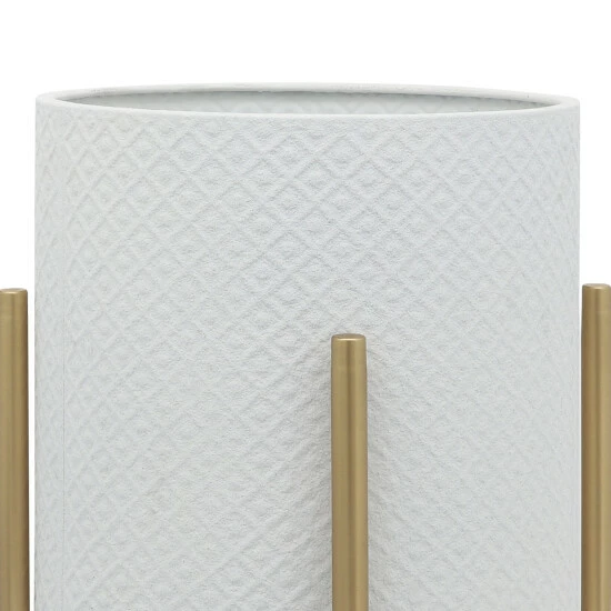 With a geometric pattern and a gold base you get a sleek and dynamic addition to your room. These planters look good with or without plants, side by side or apart.Sagebrook Home has been formed from a love of design, a commitment to service and a dedication to quality. They create and import fashion forward items in the most popular design styles. Backed with years of experience in the textile field, They are now providing a complete Home decor story. the combination of wall decor, furniture, lighting and Home accessories are all coordinated with textiles to provide a complete Home look. Sagebrook Home is committed to providing the best Home dรฉcor and accent pieces at value prices. Item 1 Dimensions: 14x14x23/Item 2 Dimensions: 11x11x19/Planter 1 Only Dims:12x12x14/Planter 2 Only Dims:10x10x11/Color: White Materials: Iron, Iron Category: Outdoor Decor, Planters Product Theme / Style / Trend: Contemporary Country Of Manfacture: Cn