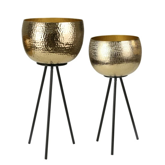 A set of planters with elliptical pots that contain a honey comb design and are enriched in gold. The pots are levelled by trilateral metal legs. Perfect dual to emphasize elegance in any home or office.Sagebrook Home has been formed from a love of design, a commitment to service and a dedication to quality. They create and import fashion forward items in the most popular design styles. Backed with years of experience in the textile field, They are now providing a complete Home decor story. the combination of wall decor, furniture, lighting and Home accessories are all coordinated with textiles to provide a complete Home look. Sagebrook Home is committed to providing the best Home dΓ©cor and accent pieces at value prices. Item 1 Dimensions: 12x12x26/Item 2 Dimensions: 11x11x22/Planter 1 Only Dims:12x12x10/Planter 2 Only Dims:11x11x10/Color: Gold Materials: Metal, Iron Category: Outdoor Decor, Planters Product Theme / Style / Trend: Glam Country Of Manfacture: In