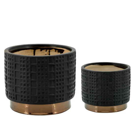 Set Of 2 Mesh Metallic Planters 6″/8″, Black. Place These Black Matte, Mesh Design, Ceramic Planters In Any Space To Enhance The Room With A Peaceful Environment. These Ceramic Planters Have An Elegant Stylish Black Matte Mesh Design On The Planter, The Base Is A Beautiful Gold.Sagebrook Home has been formed from a love of design, a commitment to service and a dedication to quality. They create and import fashion forward items in the most popular design styles. Backed with years of experience in the textile field, They are now providing a complete Home decor story. the combination of wall decor, furniture, lighting and Home accessories are all coordinated with textiles to provide a complete Home look. Sagebrook Home is committed to providing the best Home dΓ©cor and accent pieces at value prices. Item 1 Dimensions: 8x8x7/Item 2 Dimensions: 6x6x5/Color: Black Materials: Ceramic Category: Outdoor Decor, Planters Product Theme / Style / Trend: Contemporary Country Of Manfacture: Cn