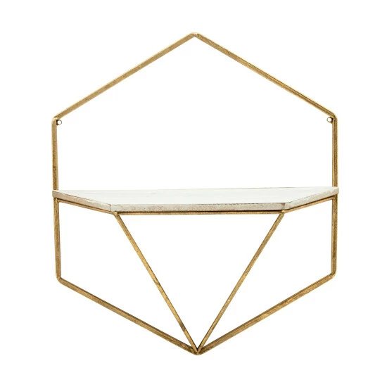 Set Of 2 Metal/Wood Hexagon Wall Shelves, Gold And White. This Set Of Metal Hexagon Shelves Will Add A Perfect Amount Of Modern Rustic Charm To Your Home Or Office. Anywhere You Decide To Put The Hexagon Shelf Will Look Astonishing. They Are The Perfect Size For Displaying Various Home Decors. Item Dimensions:17×6.75×16.75/Color: Gold Materials: Mdf, Iron, Iron Category: Wall Decor, Wall Storage Product Theme/Style/Trend: Contemporary Country Of Manfacture: Cn