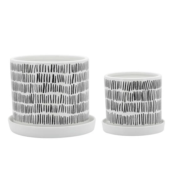 Display your most beloved plants in these beautiful planters. Featuring a abstract outside pattern carved into the material, with a saucer plate to prevent any dripping water from hitting your floor or carpet. A beautiful set that you and your plants will enjoy!Sagebrook Home has been formed from a love of design, a commitment to service and a dedication to quality. They create and import fashion forward items in the most popular design styles. Backed with years of experience in the textile field, They are now providing a complete Home decor story. the combination of wall decor, furniture, lighting and Home accessories are all coordinated with textiles to provide a complete Home look. Sagebrook Home is committed to providing the best Home dรฉcor and accent pieces at value prices. Item 1 Dimensions: 8x8x8/Item 2 Dimensions: 6x6x6/Color: White Materials: Ceramic Category: Outdoor Decor, Planters Product Theme / Style / Trend: Contemporary Country Of Manfacture: Cn