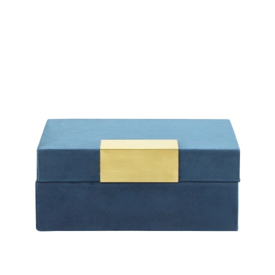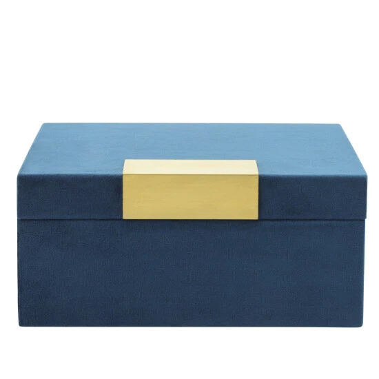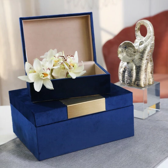 Diamonds are foreverβ¦unless they get lost. Here to help, this two-piece jewelry box set makes sure bracelets, bangles, you name it, are safely tucked away. Constructed sturdily from wood and upholstered in velvet fabric, it provides ample space to keep your jewelry safely stored. This piece is beautiful together or separately wherever you see fit. Item 1 Dimensions: 9x7x4/Item 2 Dimensions: 7x5x3/Color: Blue Materials: Mdf, Metal Category: Decorative Accessories, Boxes Product Theme / Style / Trend: Glam Country Of Manfacture: Cn