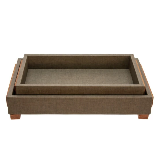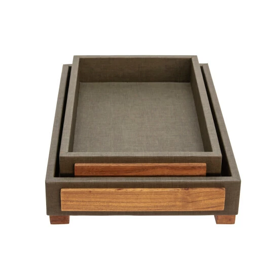 A perfect set of accent trays to help decorate your space. Made of wood and covered with faux leather material to give a stunning look. Featuring a lovely metal and glass set of handle for additional style. Made to match any glamorous decor in your home, especially when used as a display tray on your console table or entry way. Item 1 Dimensions: 18x12x3/Item 2 Dimensions: 16x10x3/Color: Green Materials: Mdf, Faux Leather, Pine Category: Decorative Accessories, Trays Product Theme/Style/Trend: Contemporary Country Of Manfacture: In