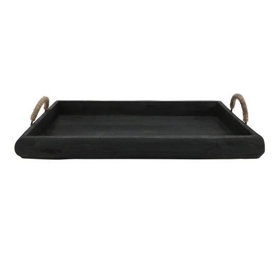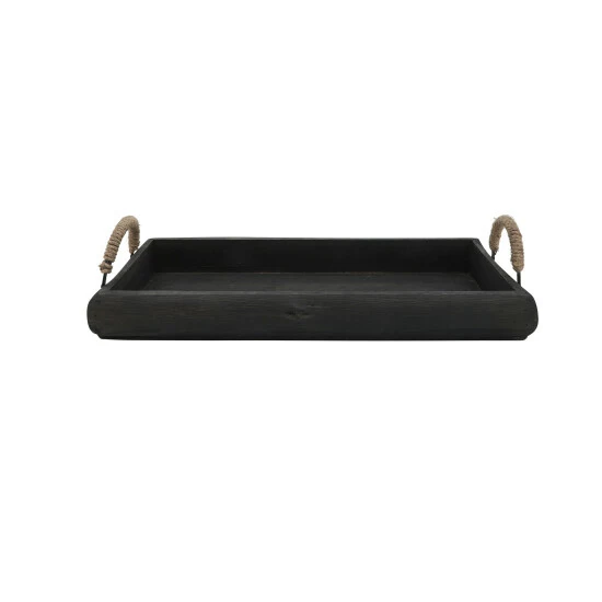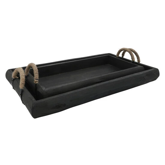 Accent your home interior decor with this earthy set of wooden trays. Featuring metal handles with a woven natural brown touch for a beautiful contrast to its wooden body counterpart. With a uniform wood burn finish to give your home more depth in color schemes. A perfect way to display you favorite decor! Item 1 Dimensions: 24x14x5/Item 2 Dimensions: 20x10x4/Color: Black Materials: Wood Category: Decorative Accessories, Trays Product Theme / Style / Trend: Contemporary Country Of Manfacture: Cn