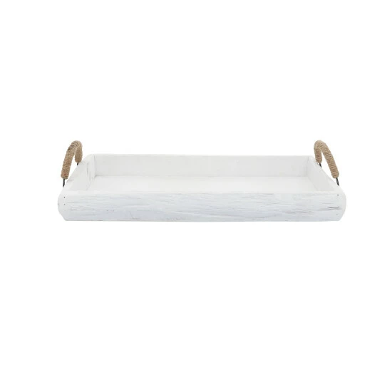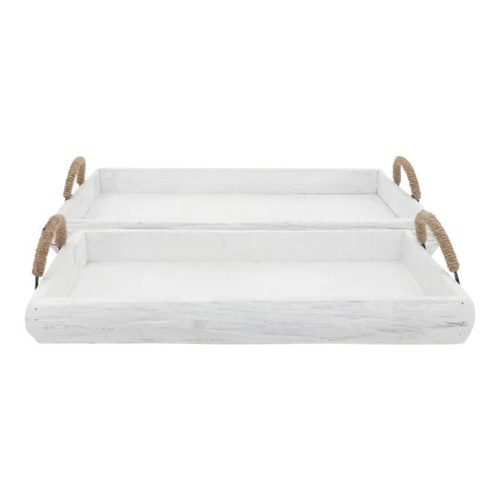 Set of 2 Wood Trays in White Wash. Accent your home interior decor with this earthy set of wooden trays. Featuring metal handles with a woven natural brown touch for a beautiful contrast to its wooden body counterpart. With a uniform wood burn finish to give your home more depth in color schemes. A perfect way to display you favorite decor! Item 1 Dimensions: 24x14x5/Item 2 Dimensions: 20x10x4/Color: White Materials: Wood Category: Decorative Accessories, Trays Product Theme/Style/Trend: Casual Home Country Of Manfacture: Cn